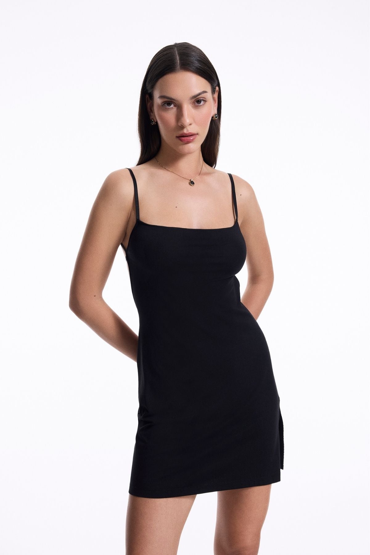Its soft fabric gently embraces your skin, offering a striking silhouette with a deep back neckline and delicate straps that shape the bust. Side slits enhance freedom of movement, while its minimal design combines elegance and comfort for both home and outings.